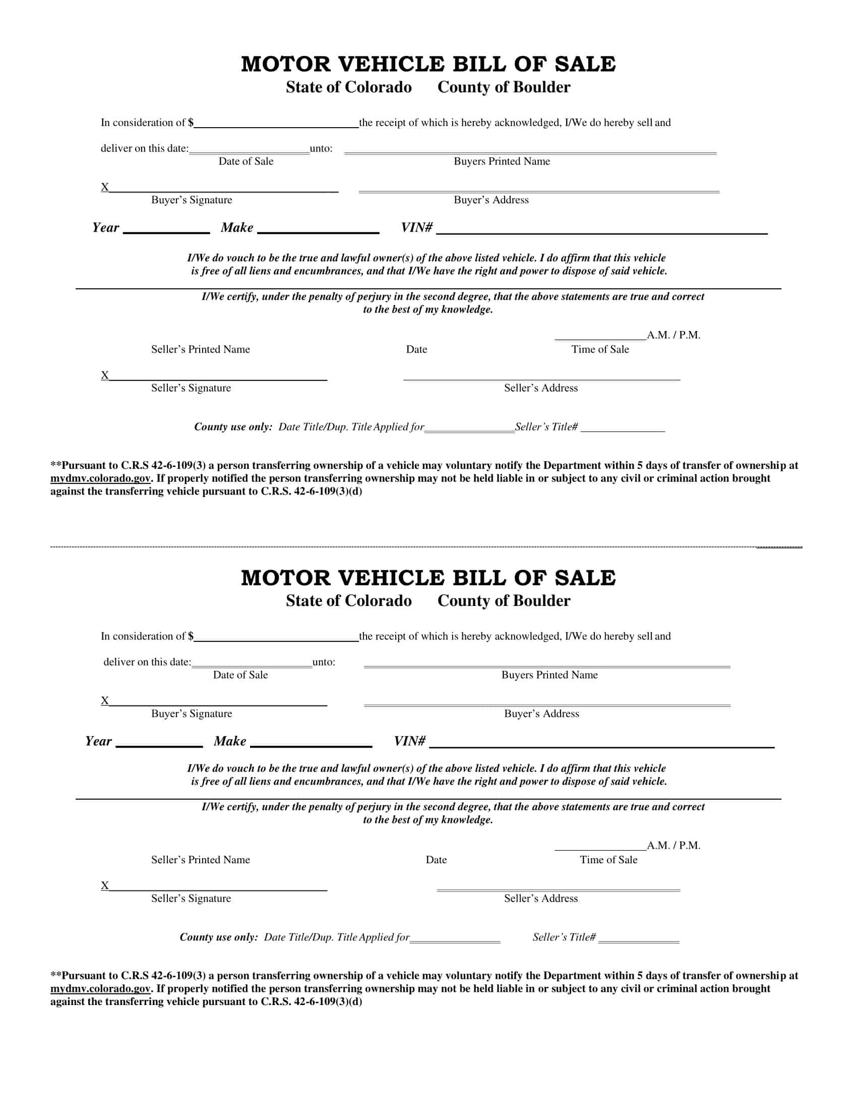 The paper provides the essential info of the house (general protected area, variety of floorings and bed rooms, and so on), the vendor and the purchaser, and functions as a proof of transfer of possession over an already agreed monetary sum.Join Us colorado bill of sale for a manufactured home website